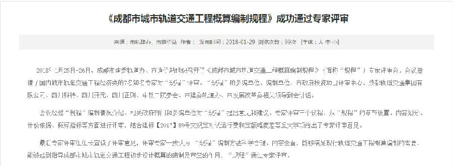 《成都市城市軌道交通工程概算編制規(guī)程》成功通過專家評審